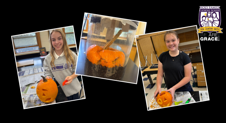 Mrs. Phillips’ seventh grade scientists put their curiosity to work this week during a Pumpkin in a Jar lab. Each student carved a pumpkin and then sealed it in a glass jar to create a miniature ecosystem. Students will have the opportunity to observe the transformation as the pumpkins move through the stages of decay and eventually new growth.